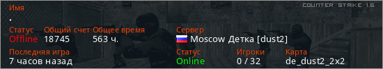 Играет на Counter Strike 1.6 сервере. Страна: РоссияПервый раз замечен 10:07 30.07.2020