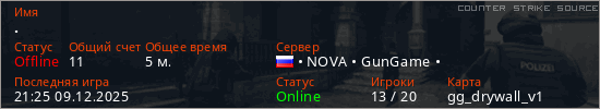 Играет на Counter Strike Source сервере. Страна: РоссияПервый раз замечен 21:21 09.12.2025