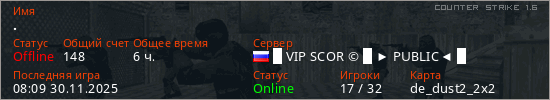 Играет на Counter Strike 1.6 сервере. Страна: РоссияПервый раз замечен 20:56 13.08.2025