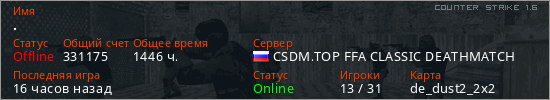 Играет на Counter Strike 1.6 сервере. Страна: РоссияПервый раз замечен 14:20 10.11.2019