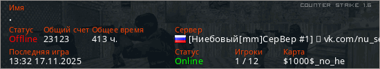 Играет на Counter Strike 1.6 сервере. Страна: РоссияПервый раз замечен 14:09 05.01.2021