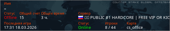 Играет на Counter Strike Global Offensive сервере. Страна: РоссияПервый раз замечен 13:20 26.01.2025