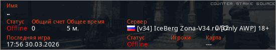 Играет на Counter Strike Source сервере. Страна: РоссияПервый раз замечен 17:52 30.03.2026