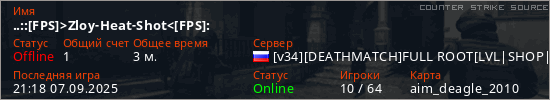 Играет на Counter Strike Source сервере. Страна: РоссияПервый раз замечен 21:18 07.09.2025