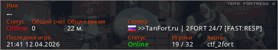 Играет на Team Fortress 2 сервере. Страна: РоссияПервый раз замечен 09:22 01.04.2026