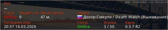 Играет на San Andreas Multiplayer сервере. Страна: РоссияПервый раз замечен 17:15 12.03.2026