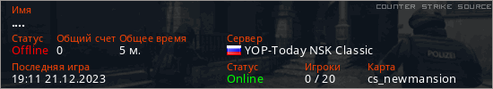 Играет на Counter Strike Source сервере. Страна: РоссияПервый раз замечен 19:01 21.12.2023