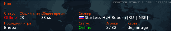 Играет на Counter Strike Global Offensive сервере. Страна: РоссияПервый раз замечен 20:01 12.01.2026