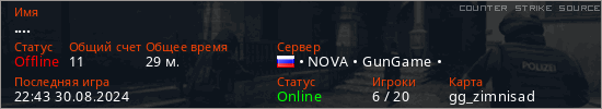Играет на Counter Strike Source сервере. Страна: РоссияПервый раз замечен 17:24 04.08.2023
