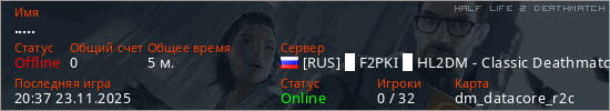 Играет на Half Life 2 DeathMatch сервере. Страна: РоссияПервый раз замечен 20:31 23.11.2025