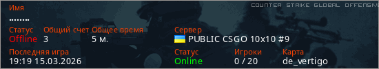 Играет на Counter Strike Global Offensive сервере. Страна: УкраинаПервый раз замечен 19:15 15.03.2026