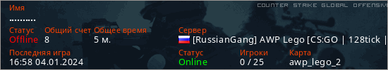 Играет на Counter Strike Global Offensive сервере. Страна: РоссияПервый раз замечен 16:35 04.01.2024