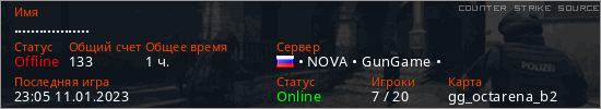 Играет на Counter Strike Source сервере. Страна: РоссияПервый раз замечен 20:07 11.01.2023