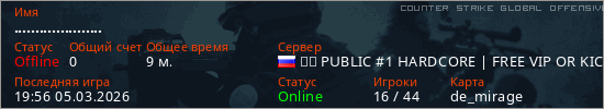 Играет на Counter Strike Global Offensive сервере. Страна: РоссияПервый раз замечен 19:45 05.03.2026
