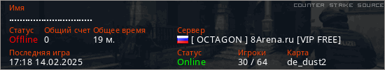 Играет на Counter Strike Source сервере. Страна: РоссияПервый раз замечен 12:22 25.01.2024