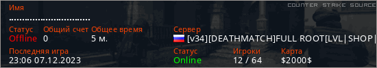 Играет на Counter Strike Source сервере. Страна: РоссияПервый раз замечен 22:47 07.12.2023