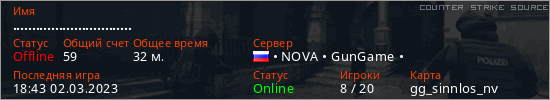 Играет на Counter Strike Source сервере. Страна: РоссияПервый раз замечен 18:10 02.03.2023