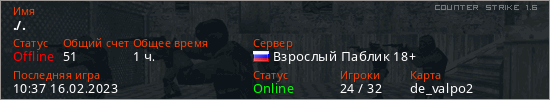 Играет на Counter Strike 1.6 сервере. Страна: РоссияПервый раз замечен 08:23 13.02.2023