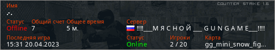 Играет на Counter Strike 1.6 сервере. Страна: РоссияПервый раз замечен 15:19 20.04.2023