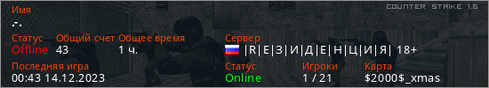 Последний раз был в сети 00:43 14.12.2023 Игрок с таким ником замечен на 22 серверах