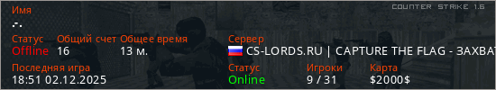 Играет на Counter Strike 1.6 сервере. Страна: РоссияПервый раз замечен 15:21 21.06.2023