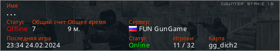 Играет на Counter Strike 1.6 сервере. Страна: РоссияПервый раз замечен 22:43 24.02.2024