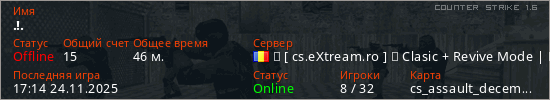 Играет на Counter Strike 1.6 сервере. Страна: РумынияПервый раз замечен 03:11 09.11.2024