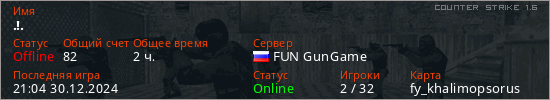 Играет на Counter Strike 1.6 сервере. Страна: РоссияПервый раз замечен 17:31 06.10.2023