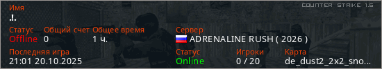 Играет на Counter Strike 1.6 сервере. Страна: РоссияПервый раз замечен 20:47 20.10.2025