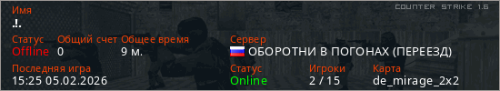 Играет на Counter Strike 1.6 сервере. Страна: РоссияПервый раз замечен 17:15 02.02.2026