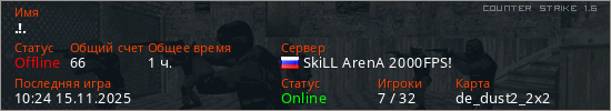 Играет на Counter Strike 1.6 сервере. Страна: РоссияПервый раз замечен 14:53 09.10.2022