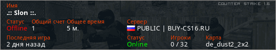 Играет на Counter Strike 1.6 сервере. Страна: РоссияПервый раз замечен 20:04 15.03.2026