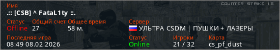 Играет на Counter Strike 1.6 сервере. Страна: РоссияПервый раз замечен 19:10 13.02.2024