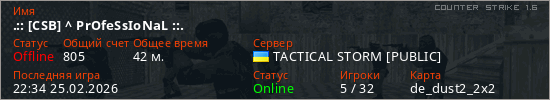 Играет на Counter Strike 1.6 сервере. Страна: УкраинаПервый раз замечен 20:55 25.02.2026