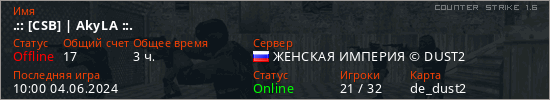 Играет на Counter Strike 1.6 сервере. Страна: РоссияПервый раз замечен 19:59 30.03.2022