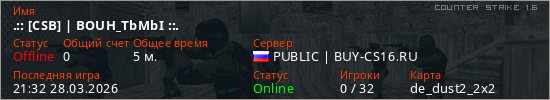 Играет на Counter Strike 1.6 сервере. Страна: РоссияПервый раз замечен 21:27 28.03.2026