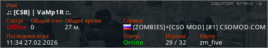 Играет на Counter Strike 1.6 сервере. Страна: РоссияПервый раз замечен 14:07 24.02.2026