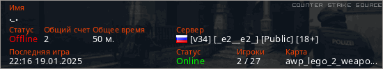 Играет на Counter Strike Source сервере. Страна: РоссияПервый раз замечен 15:50 10.08.2024