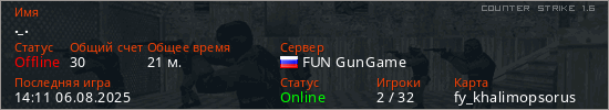 Играет на Counter Strike 1.6 сервере. Страна: РоссияПервый раз замечен 13:12 17.08.2023