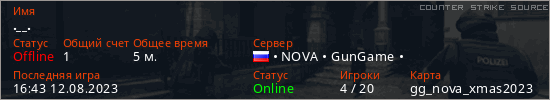 Играет на Counter Strike Source сервере. Страна: РоссияПервый раз замечен 16:35 12.08.2023