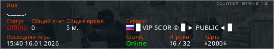 Играет на Counter Strike 1.6 сервере. Страна: РоссияПервый раз замечен 15:36 16.01.2026
