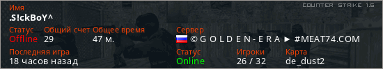 Играет на Counter Strike 1.6 сервере. Страна: РоссияПервый раз замечен 17:12 21.04.2026
