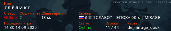 Играет на Counter Strike Global Offensive сервере. Страна: РоссияПервый раз замечен 00:48 23.03.2024