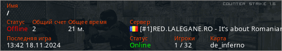 Играет на Counter Strike 1.6 сервере. Страна: РумынияПервый раз замечен 20:54 24.06.2023