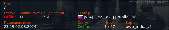 Играет на Counter Strike Source сервере. Страна: РоссияПервый раз замечен 19:16 13.01.2024