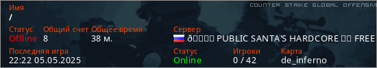 Последний раз был в сети 22:22 05.05.2025 Игрок с таким ником замечен на 54 серверах