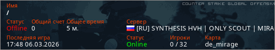 Играет на Counter Strike Global Offensive сервере. Страна: РоссияПервый раз замечен 17:46 06.03.2026