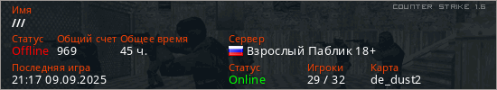 Последний раз был в сети 21:17 09.09.2025 Игрок с таким ником замечен на 54 серверах