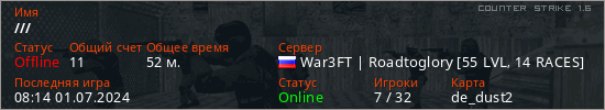 Играет на Counter Strike 1.6 сервере. Страна: РоссияПервый раз замечен 13:09 02.07.2022