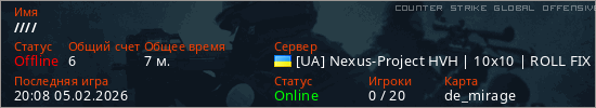 Играет на Counter Strike Global Offensive сервере. Страна: УкраинаПервый раз замечен 19:55 05.02.2026